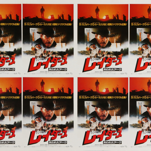 A rare two-sided uncut printer's proof for the Japanese release of Raiders of the Lost Ark. When cut, this sheet would have provided eight Japanese B5 or 'Chirashi' mini posters for use as flyers in cinema lobbies to promote current and future releases. Popular with Japanese collectors, Chirashi often take the form of a miniature replica of the movie's poster, with information printed on the reverse.