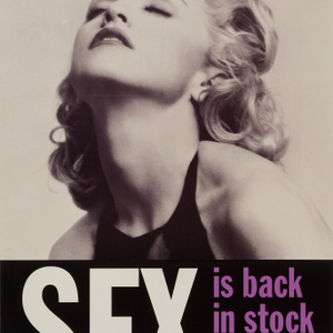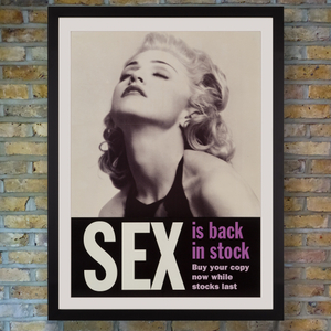 An extremely rare British bookstore promotional poster for Madonna's controversial coffee table book Sex, released on 21st October 1992 by Warner Books, the day after the release of her fifth studio album Erotica. The aluminium-bound book came sealed in a silver mylar bag with a warning label, and featured 128 pages of erotica and sexual fantasies written by Madonna, with photographs taken by Steven Meisel and film frames shot by Fabien Baron. With a first printing of one milion copies, the book had the largest initial release of any illustrated book in publishing history. An immediate commercial success, Sex sold over 150,000 copies on the first day of release and by 8th November had topped the New York Times bestseller list. The book remains the fastest selling coffee table book of all time. A similar version of this poster reads Sex will be back in December, so one can tentatively date this poster, reading Sex is back in stock, to December 1992.