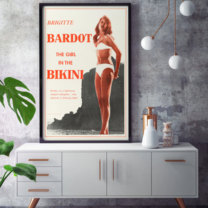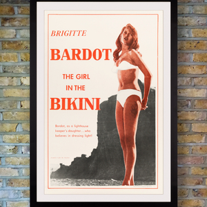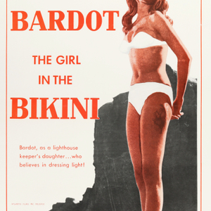 Utilising a posterised film still of a fresh-faced seventeen-year-old Brigitte Bardot frolicking on a rocky Corsican shore, this scarce US One Sheet for the 1958 American release of The Girl in the Bikini, flaunted the stunning young starlet in her dazzling white two-piece. One of Bardot's first film roles, the 1952 French adventure-romance (released in France as Manina, la fille sans voiles) is notable for featuring one of the first appearances of the bikini on film, at a time when the bikini was still widely considered immodest. When released six years later in the US to capitalise on Bardot's rise to international stardom as a sex symbol following her breakout role in 1956's And God Created Woman, the distributors clearly chose to lean into the controversy over the younger Bardot's scanty swimwear, renaming the film The Girl in the Bikini to attract US audiences with the quippy tagline "Bardot as a lighthouse keeper's daughter... who believes in dressing light!" Despite the US Motion Picture Production Code prohibiting exposure of the midriff on film, the picture was able to skirt the regulations as a foreign film.