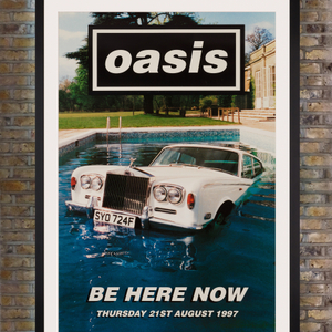 An oversized UK promotional poster featuring photography by Michael Spencer Jones for the 1997 release of Britpop band Oasis' third studio album 'Be Here Now,' following the worldwide success of 'Definitely Maybe' (1994) and '(What's the Story) Morning Glory?' (1995). Predominantly written by Noel Gallagher during a Caribbean holiday with Kate Moss, Johnny Depp and Mick Jagger, the hotly anticipated release became the fastest selling album in British chart history. The album cover artwork featured a shot of the band in the garden at Stocks House in Hertfordshire, positioned around a white Rolls Royce floating in the middle of a swimming pool in a symbolic statement of rock and roll excess. Photographer Michael Spencer Jones, who had previously shot the band's first two album covers, later recalled: "It was an expensive shoot, that. An hundred grand shoot and record companies don’t spend that kind of money making one photo. It’s not normal... Maybe for a Pink Floyd cover but it’s a big budget for an album cover. You don’t spend that much recording an album... Originally, it was an homage to Keith Moon. A bit of rock and roll surrealism, I suppose." This impressive billboard poster focused on the iconic image of the submerged Rolls, which featured the same number plate as the police van on the cover of The Beatles' 'Abbey Road.' Asked by NME in 1997 whether the submerged Rolls Royce was a nod to The Who's Keith Moon, who was rumoured to have driven a Rolls into a swimming pool during his 21st birthday party, Noel replied "Nah, I suppose it's just a rock'n'roll cliché, innit? And being a rock'n'roll band, we're into all that shit."