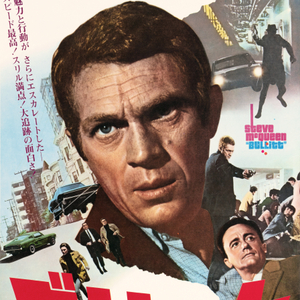 In one of his most famous roles at the pinnacle of his career, Steve McQueen is the essence of cool as tough cop Frank Bullitt in this action-packed 1968 thriller, featuring one of movie history's most memorable and influential car chases through the streets of San Francisco. Issued for the film's original theatrical release in Japan, this scarce B2 poster is notable for featuring Bullitt's 1968 Highland Green Ford Mustang GT 390. First released in Japan in December 1968, the film was still in continuous release when it won an Academy Award in April 1969 and an updated poster design with an Oscar statuette was issued to theaters to capitalize on this. This is the more sought after pre-Academy Awards style without the Oscars notice.