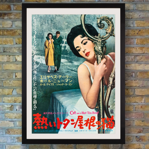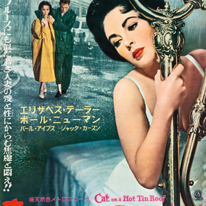 A sultry Elizabeth Taylor smoulders on this extremely rare and seductive Japanese B2 poster for the original release of MGM's Cat on a Hot Tin Roof in Japan. In a legendary pairing, Paul Newman co-starred as apathetic husband Brick opposite Taylor as wife Maggie "the Cat" in the classic film adaptation of Tennessee Williams' 1955 Pulitzer Prize-winning play. Driven to drink by the death of his best friend Skipper, Brick continues to coldly reject the passionate advances of the feline Maggie, until the couple's dysfunctional marriage problems come to a head during Brick's father's 65th birthday celebrations in Mississippi. Although the adaptation was well-received by both critics and audiences, becoming the third highest-grossing film of 1958, many - including author Tennessee Williams - were unhappy with the removal of the homosexual themes present in the original play. Nevertheless, the film was recognised with six Academy Award nominations including Best Picture, Best Director (Richard Brooks), Best Actor (Newman) and Best Actress (Taylor). Taylor's fine performance as the titular "Cat" is all the more notable considering her beloved husband Mike Todd was tragically killed in a plane crash just over a week into the production.