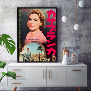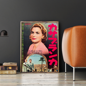 Here's looking at you kid! A knockout Ingrid Bergman takes centre stage on this beautiful B2 poster for the 1962 Japanese re-release of the enduring Hollywood classic Casablanca, her wistful gaze setting the tone for the quintessential romantic drama. Almost 80 years after it was first released, Casablanca remains one of the world's best loved and most quoted films, transcending its era to entrance generations of moviegoers. Directed by Michael Curtiz based on an unproduced stage play and adapted for the screen by Julius and Philip G. Epstein, along with Howard Koch, the masterful wartime tale follows Humphrey Bogart as an American nightclub owner in Vichy-controlled Casablanca who sacrifices his renewed feelings for former lover Bergman to help her and her husband escape in order to continue their fight against the Nazis. Rushed into release in November 1942 to capitalise on the publicity surrounding the Allied invasion of North Africa and the capture of Casablanca, the film exceeded Warner Bros. expectations, achieving wide critical acclaim and box office success, and going on to win the Academy Awards for Best Picture, Best Director and Best Adapted Screenplay. With it's rich atmosphere, pervasive dialogue, sentimental theme song and magnetic, career-defining performances from Bogart and Bergman, the film's popularity only seems to grow "As Time Goes By," consistently voted as one of the greatest films in Hollywood history. It follows that any paper for Casablanca has become increasingly sought after and scarce, snapped up by collectors at every opportunity. Featuring lush artwork, unique to this Japanese release, this incredibly rare poster in original unbacked condition is a treausre for any Casablanca connoisseur.
