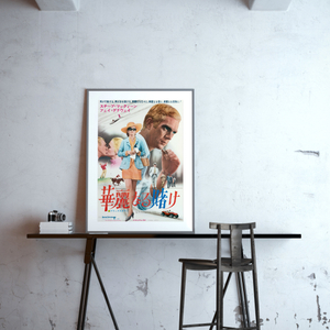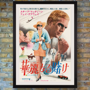 Starring Steve McQueen and Faye Dunawaye, Norman Jewison's stylish 1968 caper 'The Thomas Crown Affair' saw debonair bank executive and multi-million dollar heist mastermind Thomas Crown meet his match in the glamorous insurance investigator assigned to the case. Their steamy one-minute kiss features among key scenes on this action-packed B2 format poster for the first release of the film in Japan. The film was nominated for two Academy Awards, winning Best Original Song for Michel Legrand's 'The Windmills of Your Mind'. "He was young, handsome, a millionaire, and he'd just pulled off the perfect crime! She was young, beautiful, a super sleuth, sent to investigate it!"