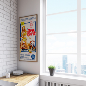 Screen siren Raquel Welch sizzles in "mankind's first bikini' on this striking Australian Daybill poster for Hammer Films unforgettable prehistoric fantasy adventure One Million Years B.C. The quintessential image of a fur-clad Welch formed the centrepiece of Hammer's marketing campaign, becoming a best-selling pinup poster and, years later, famously featuring as part of the prison escape plot in the 1994 drama The Shawshank Redemption. Set in a fictional age of co-existing cavemen and dinosaurs, the fearsome creatures were painstakingly animated by stop-motion master Ray Harryhausen, years before the advent of CGI special effects.