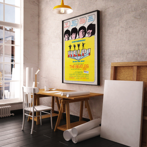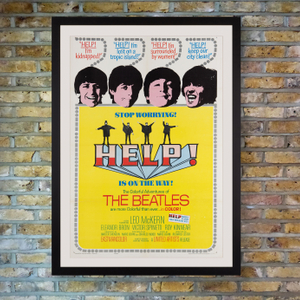 A jolly sunshine-yellow one sheet poster for the original theatrical release of the 1965 Beatles romp Help!' featuring photographer Robert Freeman's image of the Fab Four posing in flag semaphore formation for the cover of their soundtrack album of the same name. Although Freeman had envisaged the band spelling out 'HELP,' they ended up signalling random letters for a better visual arrangement. In their second feature directed by Richard Lester, John Lennon, Paul McCartney, George Harrison and Ringo Starr go on the run from an evil cult, against a soundtrack of classic Beatles tunes.