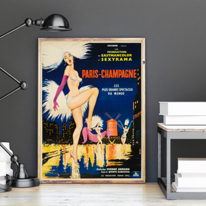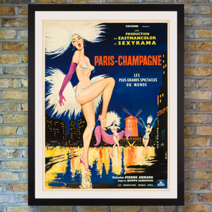 Although the film itself is somewhat unknown, released only in France and the Netherlands, this stunning French Moyenne poster for the 1964 Pierre Armand melodrama Paris-Champagne stands on it's own, with it's colourful can-can dancers set against the twinkling night lights of Paris and the Moulin Rouge. The strange dreamlike plot saw a tramp transform himself into a handsome young man to conduct a young flower-seller on a surreal whirlwind tour of the exotic Parisian night.
