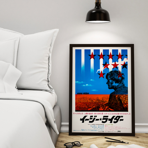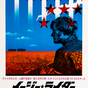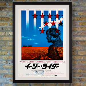 A touchstone of the American counterculture movement, Dennis Hopper's 1969 revolutionary road drama Easy Rider defined a generation of disillusioned youth, marking a turning point as the idealism of the 60s began to sour. Director Hopper and producer Peter Fonda co-wrote the screenplay and co-starred as bikers Billy and Wyatt who hit the road with the proceeds of a successful cocaine deal, travelling through the American South from Los Angeles to New Orleans to the beat of a rock and roll soundtrack, navigating the societal tensions of the 1960s and meeting hippies, prostitutes and Jack Nicholson in a standout performance as drunken lawyer George along the way. The film and its self-indulgent filmmakers were notorious for using real drugs, predominantly marijuana, in a number of scenes. A blockbuster success, the film helped to usher in the New Hollywood era which saw the major studios financing a wave of low-budget pictures by new avant-garde directors. This rather patriotic poster for the Japanese release features the same profile of Peter Fonda as used on the yellow US One Sheet poster, but in a red, white and blue colourway with additional stars and stripes motif.