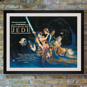 The third and final installment of George Lucas' original Star Wars trilogy saw Mark Hamill, Carrie Fisher and Harrison Ford reprise their roles as Luke Skywalker, Princess Leia and Han Solo to take on the evil empire. Originally titled Revenge of the Jedi, Lucas switched to Return of the Jedi when he realised that the concept of revenge would be out of character for the chivalric Jedi. Artist Josh Kirby's dynamic design for the British release featured a cosmic montage of key characters from the film with Darth Vader's looming presence above. Two versions of the quad poster were produced - the more common "action style" features an exploding sandskiff, Boba Fett and Imperial Guards, whereas those elements are replaced by a cuddly ewok below Han Solo in the less common "ewok style" seen here.