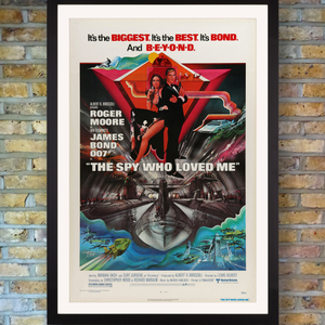 A dynamic US One Sheet poster for the 1977 blockbuster Bond classic 'The Spy Who Loved Me', designed by legendary poster artist Bob Peak. Considered Roger Moore's most memorable outing as 007, the tenth film in EON Productions' James Bond series was bigger than ever. In a globe-trotting adventure, Bond hops from a snowy ski chase to the Egyptian pyramids, teaming up with Russian agent Anya Amasova (Barbara Bach) to defeat the megalomaniac Stromberg as he threatens to destroy New York City with hijacked nuclear weapons and create a new civilisation under the sea. Bob Peak's stylised poster artwork featured Bond's famous submersible Lotus Esprit, which The Times named the second best car in the series (behind the Aston Martin DB5) in 2008. The film was nominated for three Academy Awards including Best Art Direction and Best Score.