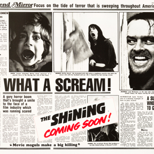 A scarce and unusual 'Weekend Mirror' style teaser quad for the British release of Stanley Kubrick's 1980 modern horror masterpiece The Shining, starring Jack Nicholson and Shelley Duvall. Based on the bestselling novel by Stephen King, the seminal psychological horror initially opened to mixed reviews, before growing momentum over the summer of 1980 to become an American box-office success. With anticipation building for the October 1980 British release, Warner Bros. made the canny marketing decision to reproduce a tabloid newspaper spread from the Saturday, August 30, 1980, edition of the Daily Mirror, on the tide of terror that is sweeping across America, for their advance British teaser campaign. Despite a demented Nicholson featuring among the striking images in stark black and white, the eye is drawn to the teaser Coming Soon! splashed in blood red across the article. Now regarded as one of the most influential horror films in cinema history, key scenes and motifs such as the eerie Grady twins have become ingrained in our popular culture, spawning numerous homages, references and parodies, including an entire sequence in Steven Spielberg's 2018 sci-fi adventure Ready Player One.
