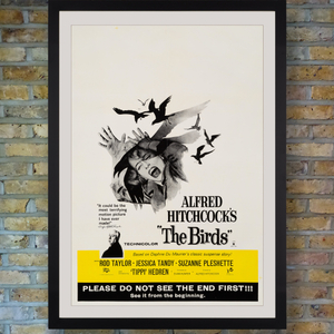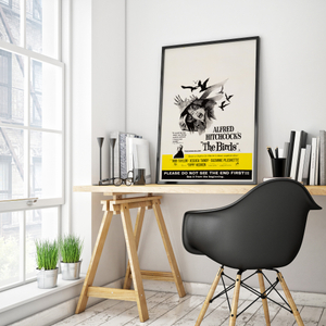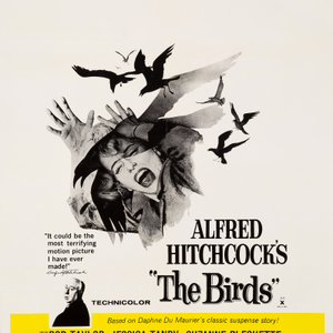 Silkscreen printed in black and yellow inks on heavy stock. Conservation backed on linen with no restoration. Prior to backing the poster had one vertical and three horizontal manual folds and another partial horizontal fold 2 in. below upper fold, with some heavy creasing and slight surface wear to folds in places, a 7 in. horizontal crease to left edge extending through Hitchcock's portrait with perpendicular creasing, a few small vertical creases around the word 'Birds' and a few small vertical creases to lower edge. Backing has smoothed and diminished these folds and creases significantly, but due to the thickness of the paper stock they have not been completely diminished and are visible on close inspection. Colours excellent.