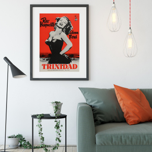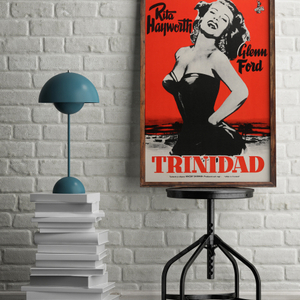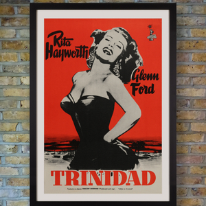 An exceedingly rare and vibrant poster for the Finnish release of Rita Hayworth's 1952 film noir Affair in Trinidad. The movie marked Hayworth's return to the screen after a three year absence during her marriage to Prince Aly Khan, and a reunion with her Gilda co-star Glenn Ford. Hayworth starred as a nightclub performer who enlists her brother-in-law to track down her husband's killer. Based on the design of the US One Sheet, artist Engel offered a masterclass in Warholian simplicity when he captured Hayworth in full bombshell mode during her fiery opening dance number.